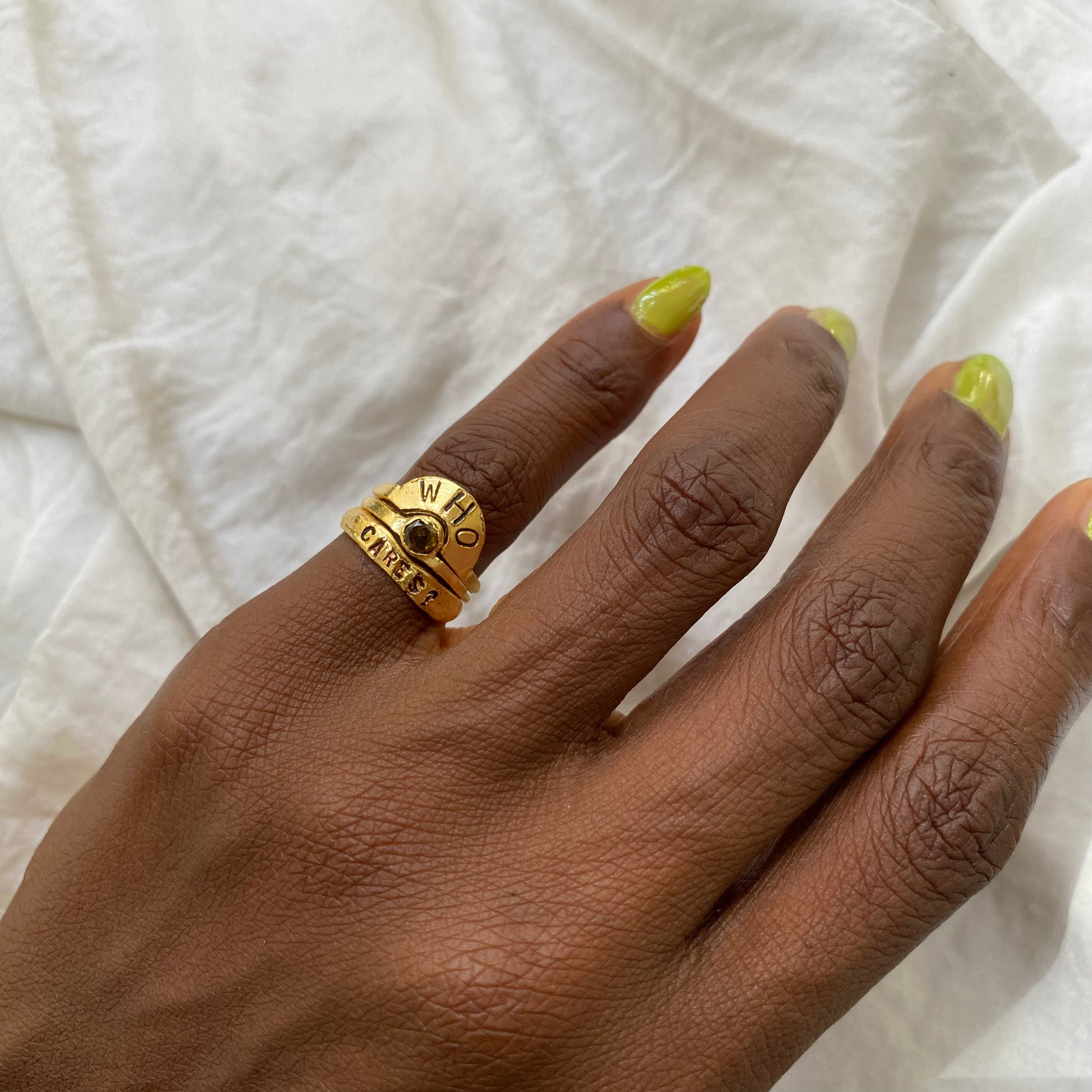 Let go and live free with this "Who Cares?" pinky ring, a bold statement of your unshakable confidence. This ring reminds you to live authentically and disregard negativity and anything that doesn’t align with your optimistic outlook, values, and sense of self-worth.