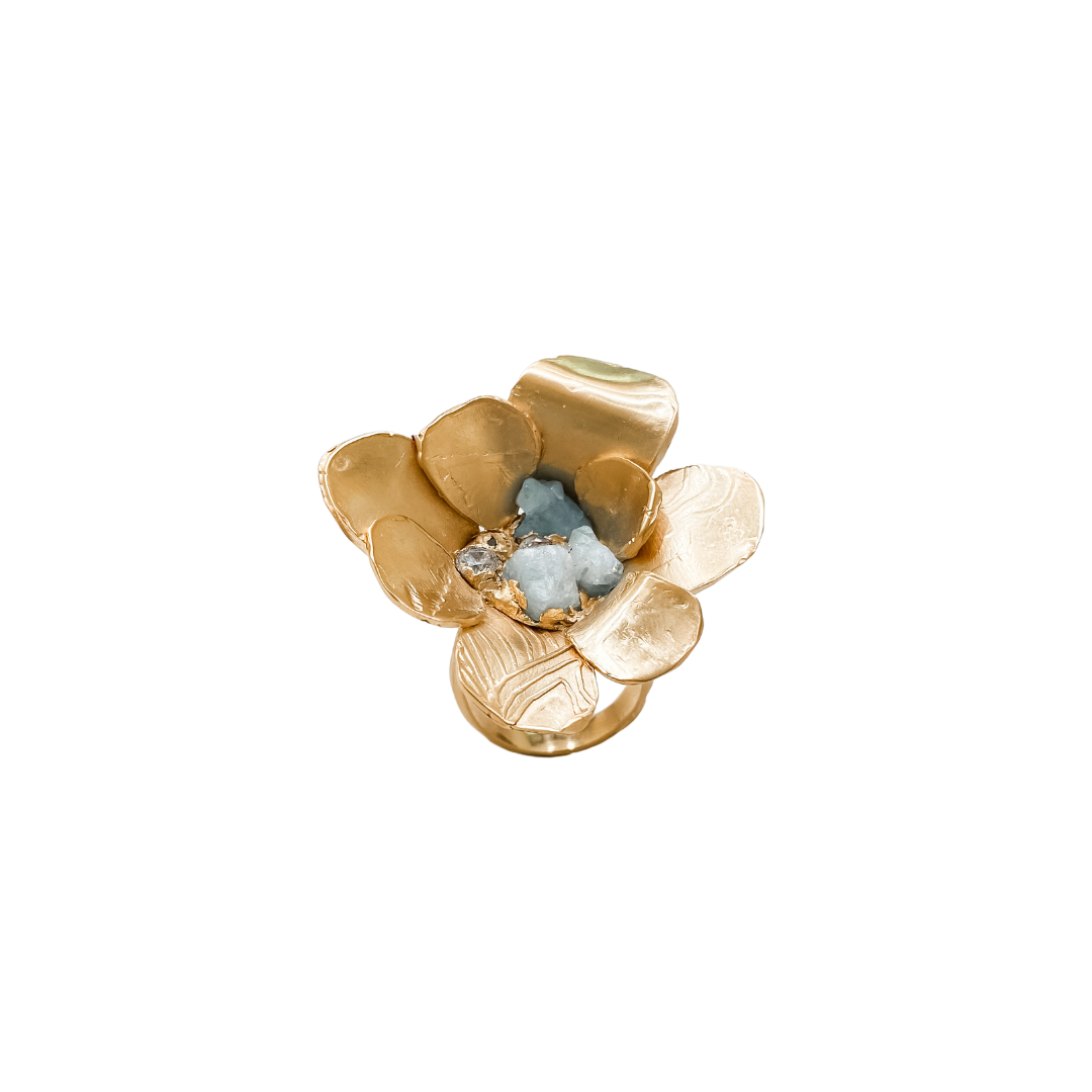 Claim the calm, clarity, and courage to grow through life's changes with this beautiful flower statement ring featuring natural aquamarine crystals.Slip it on when you need a reminder of your resilience, strength, and the beauty you bring to the world. Stand tall and bloom with confidence!